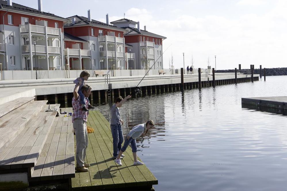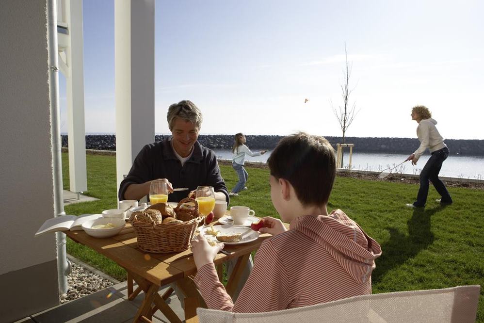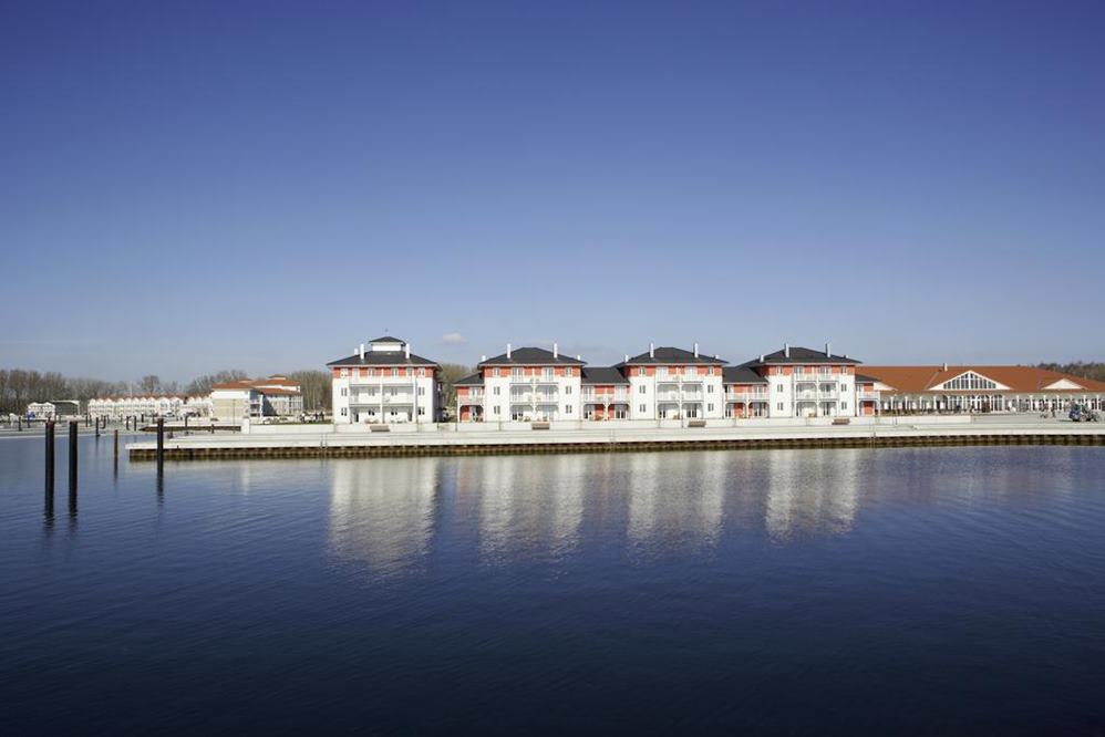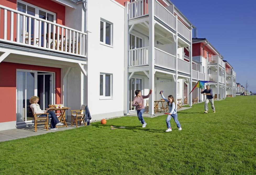 Appartements mit Meerblick: Die neue, autofreie Hotel-Appartementanlage bietet 191 Appartements in 21 Häusern. In der Anlage gibt es einen Dorfladen, ein Buffet- und ein à la Carte-Restaurant mit moderner Küche und Fischspezialitäten, eine Strandbar und die Trockendock-Bar mit Sport-TV.