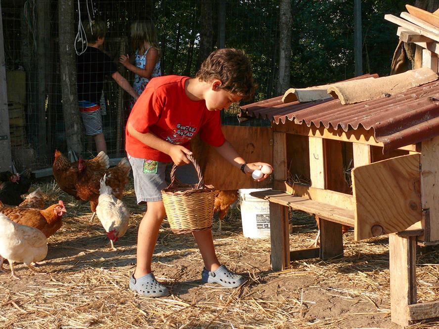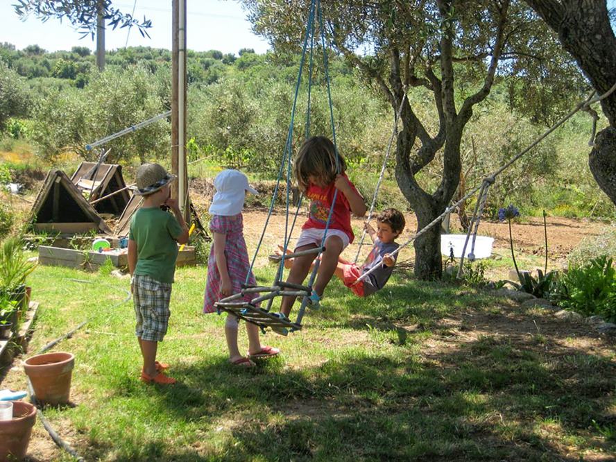 Kinderbett, Hochstuhl, Wickeltisch und Babynahrung aus biologischen Zutaten stehen zur Verfügung. Die Kinder haben viel Platz zum Spielen, es gibt Schaukeln, Sandkasten und ein paar Kinderfahrzeuge für die Kleinsten. Die grosse Attraktion sind die Tiere: Schweine, Hühner und Ziegen müssen gefüttert, die Eier eingesammelt und der Hofhund gestreichelt werden.