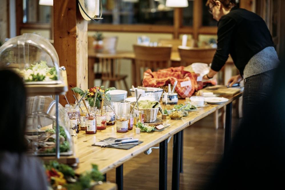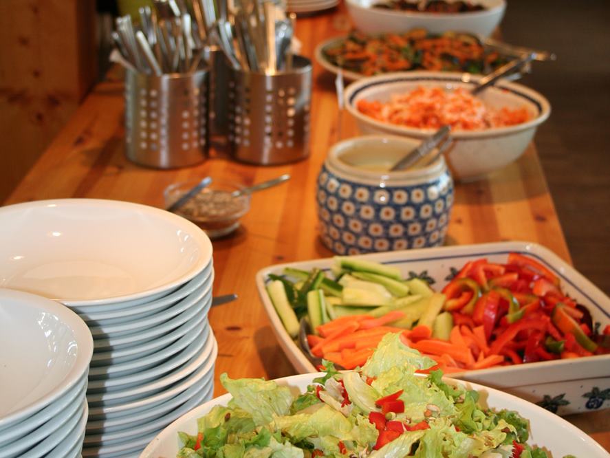 Köstlich geniessen. Wir bieten Ihnen vielfältige, leckere und gesunde Speisen am Buffet, gerne vegetarisch. Sie suchen das aus, was Ihnen am besten schmeckt. Und das zu jeder Mahlzeit. Und immer aus ökologischem Anbau. Auch bei Nahrungsmittelallergien und Diäten. Am Frühstücksbuffet finden Sie Frischkornbrei, Müsli, Brot und Brötchen vom regionalen Biobäcker. Wurst, Käse und Brotaufstriche runden das Angebot ab. Das Mittagsbuffet bietet Ihnen Suppe, Salat, Brot und Brotaufstrich. Abends gibt es Salat und Knabbergemüse, eine kleine Vorspeise vom Buffet und dann kommt der Hauptgang, der immer wieder anders und lecker is